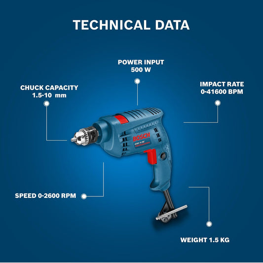 BOSCH GSB 10 RE Corded-Electric Tool Kit | 100-piece Tools Box Kit | Power Supply 500W | Impact Drill Machine | Impact Rate upto 41600 BPM | Speed upto 2600 RPM | 1 Yr Warranty