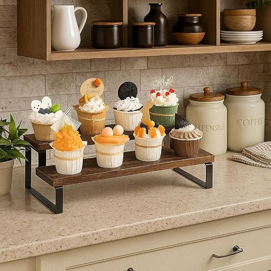 Udaipur Handicrafts Wooden Display Riser Shelf, Kitchen Counter Shelf Spice Rack Organizer, Tiered Countertop Display Shelf for Perfume, Makeup, Condiment(Brown Color) (2-Tier)