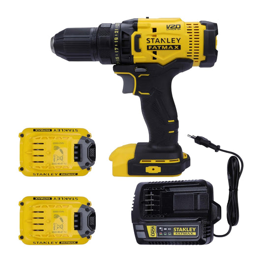 STANLEY FATMAX SCD700D2K 20V 13 mm Reversible Cordless Brushed Drill Machine Driver With 2x2.0Ah Li-ion Batteries, 1pc Charger, 2 Speed Gearbox & LED Worklight, 2 Year Warranty, YELLOW & BLACK