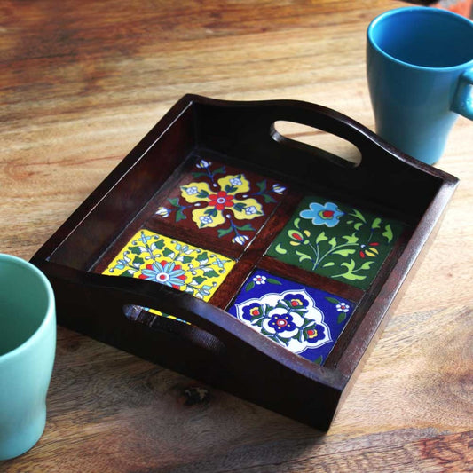 Ceramic-Blocked Wooden Serving Tray (With 4 Ceramic Tiles), Polished (8x8)