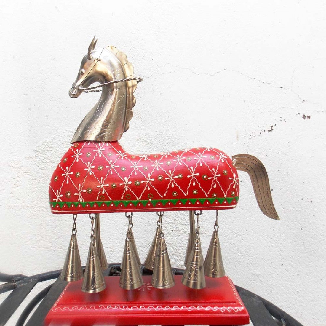 Horse sculptures and articles occupy a prominent place in Indian history. Symbolizes strength and velour, the Hand-Painted Wood and Metal Horset figurine in Cone Artwork from our Rajasthani Handicrafts range, is a decor item you must have. Elegantly crafted with a stand at the base, having colorful designs, ten bells ringing as the light wind flows, this miniature art object is a charm to have in a space.