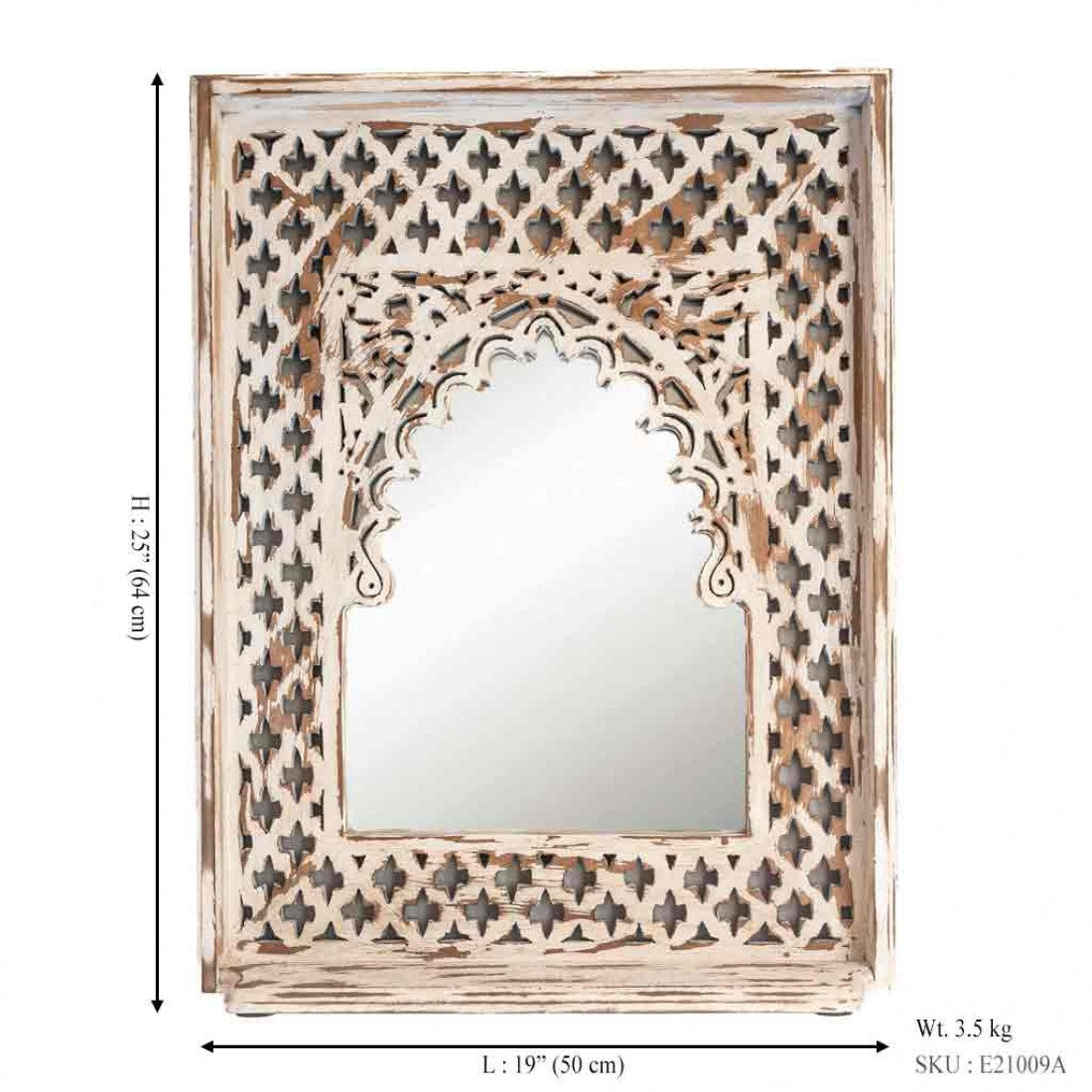 This Distressed White coloured piece adds a dash of royal antiqueness to your space. Made with the craft passed down to generations by skilled artists of Rajasthan, the frame is in the shape of Jharokha. The frame is made with intricate perforations (jali) design and has the functionality to add a mirror inside it. It also has a small platform to place decorative pieces or grooming accessories if you intend to use it as dressing mirror.