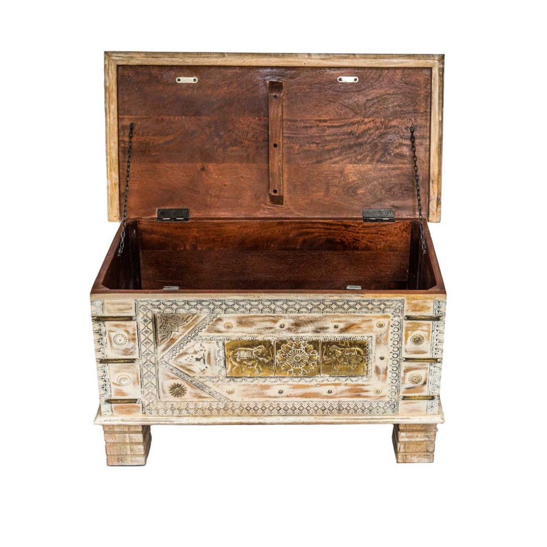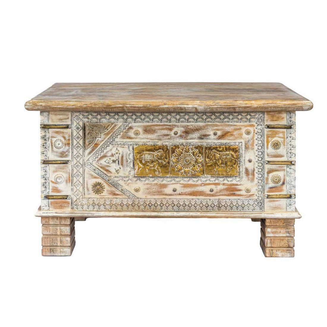 Elevate your home decor with the Treasure Box / Pitara White Rustic Finish Brass Art. This handcrafted marvel combines rustic elegance with timeless sophistication. Its white rustic finish exudes an air of timeless charm, while the intricate brass artwork adds detailed craftsmanship. Crafted from wood and brass, it's built to stand the test of time. This versatile piece serves as a jewelry box, keepsake box, storage solution, or a captivating decorative accent. A thoughtful and timeless gift option, this treasure box is a classic addition to any decor setting.