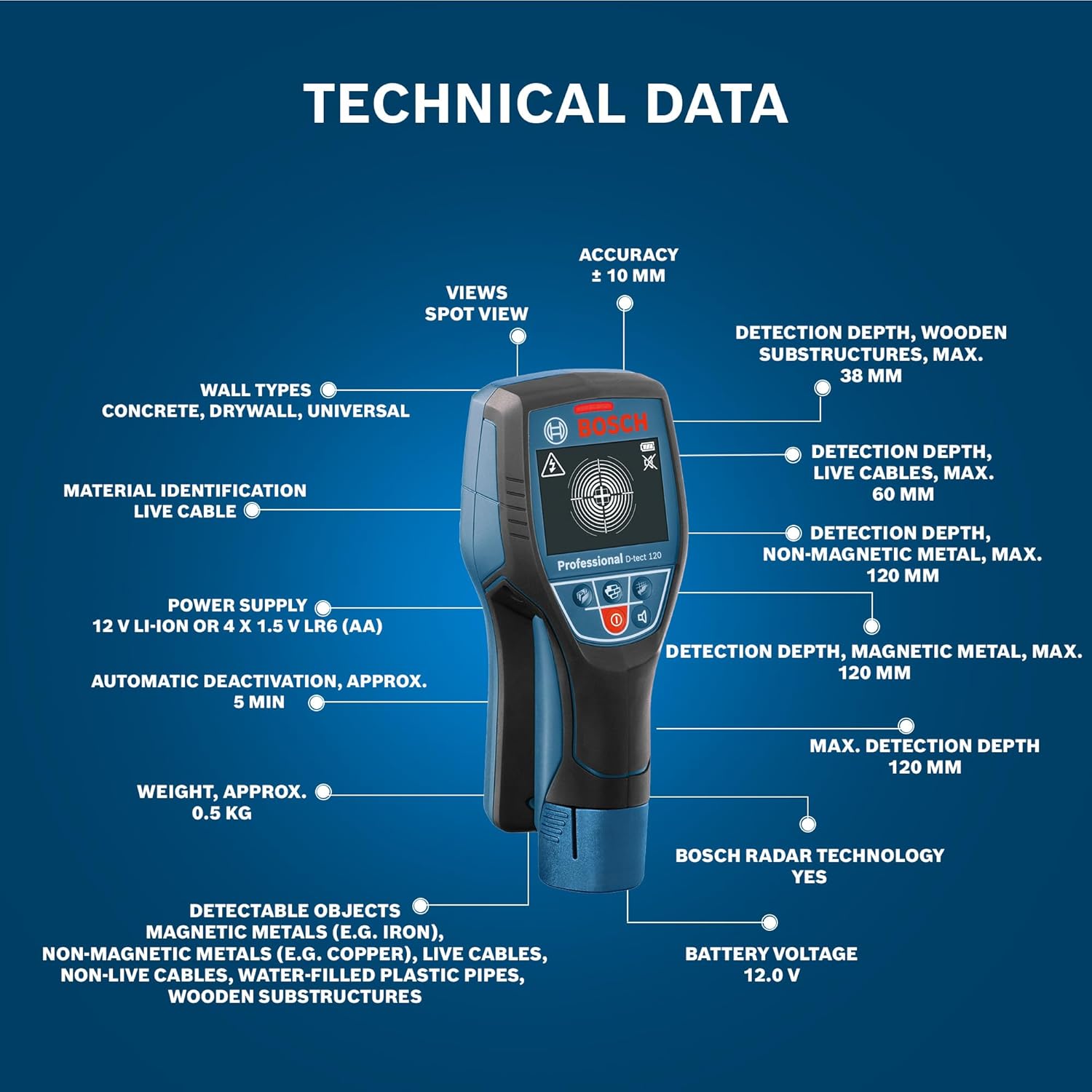 - Advanced BOSCH Radar Technology - Equipped with BOSCH Radar Technology, the D-tect 120 ensures accurate detection of metals, wires, pipes, and wooden studs up to 120mm depth for safe drilling.