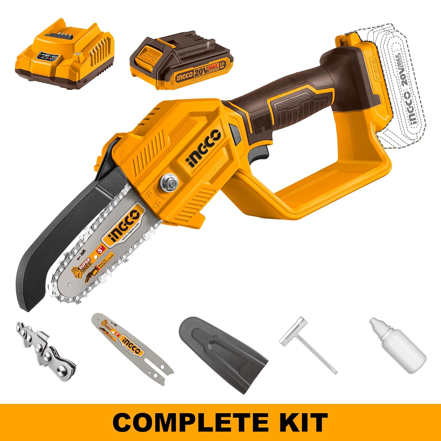 INGCO 20V Cordless Pruner Saw, Electric Mini Chain Saws, 5 m/s, With 1Pcs 2.0Ah Battery And Charger, With Saw Chain & 13mm Saw Bar