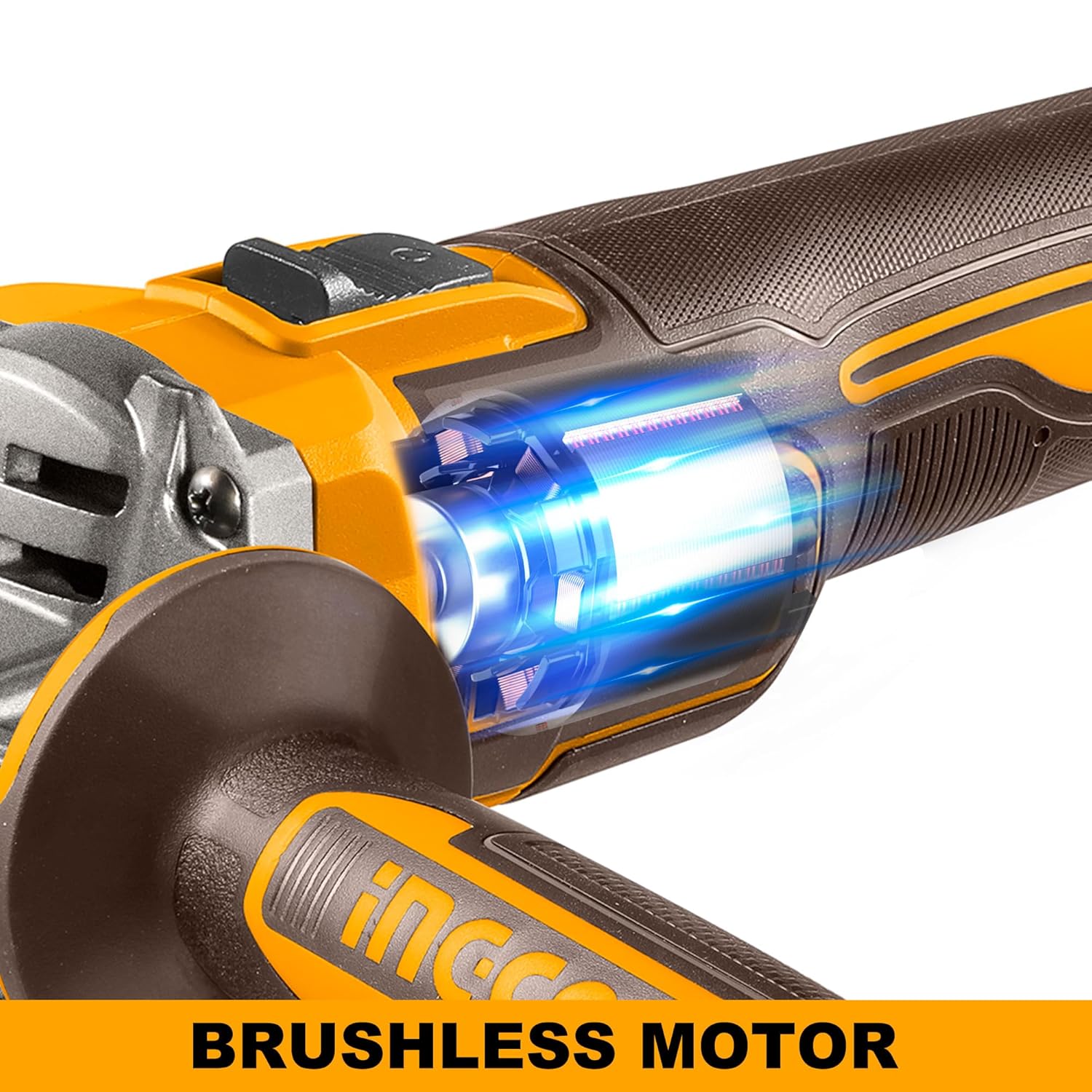 - Cordless Angle Grinder With Brushless Motor INGCO 20V Lithium-ion cordless angle grinder gives you the freedom to work without cord limit, with brushless motor, more powerful, efficient performance, and longer runtime.