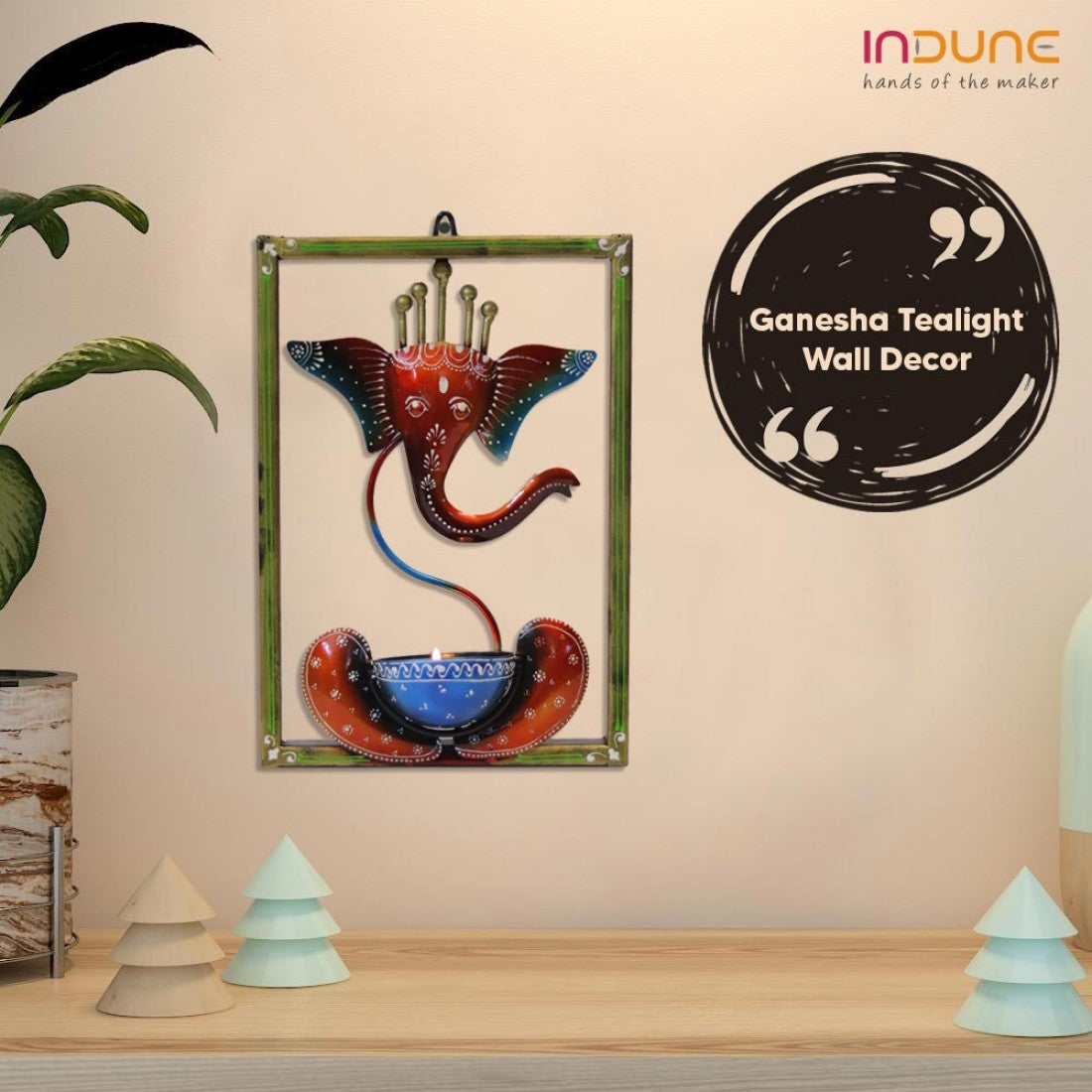 Lord Ganesha is hailed in Indian Culture at all the beginnings, be it an enterprise, a marriage, or even as simple as one's day. Indune's Traditionally Painted Ganesha T-Light Holder spreads the light of prosperity, and the warmth of love at your home. It also makes a perfect gift for your loved ones. The Ganesha T-Light holder is hand painted in Rajasthan's traditional colours and comes in an elegant, yet classy iron frame with a hanging hook. It can be hung at your doorstep to welcome guests, be a part of your Pooja ghar, or can be used as an iconic vibrant wall decor artifact for your space.