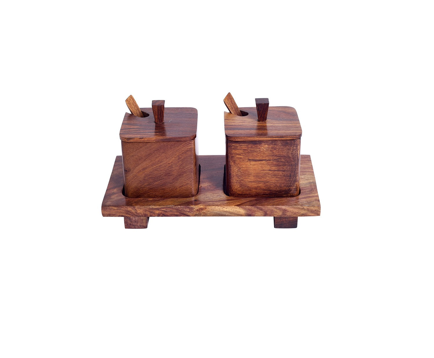 Udaipur Handicrafts Brown Set of 2 Hand carved Wooden Jars with Spoon and Tray