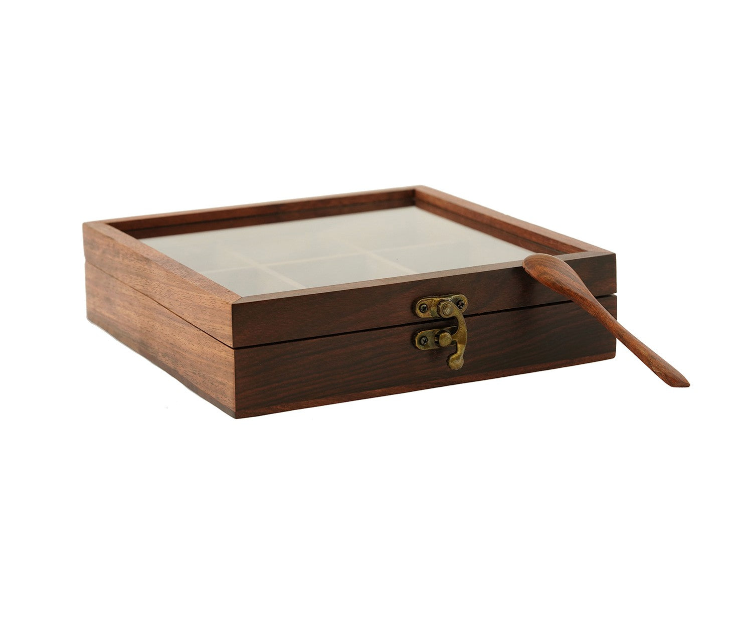 Udaipur Handicrafts Wood Brown Decorative Multi Purpose Spice Box With Nine Partitions And Spoon